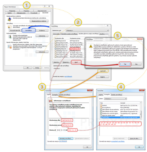 - jeżeli wszystko się zgadza i odcisk wygląda tak jak ten podany powyżej to w oknie Certyfiaty zaznaczamy dany certyfikat i klikamy Usuń i potwierdzamy operację(5).