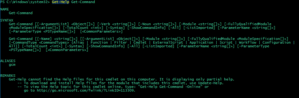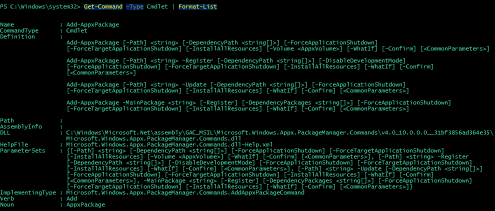 PS C:\Windows\system32> Get-Command -Type Cmdlet CommandType Name Version Source ----------- ---- ------- ------ Cmdlet Add-AppxPackage 2.0.0.0 Appx Cmdlet Add-AppxProvisionedPackage 3.0 Dism Cmdlet Add-AppxVolume 2.0.0.0 Appx Cmdlet Add-BitsFile 2.0.0.0 BitsTransfer Cmdlet Add-CertificateEnrollmentPolicyServer 1.0.0.0 PKI Cmdlet Add-Computer 3.1.0.0 Microsoft.PowerShell.Management Cmdlet Add-Content 3.1.0.0 Microsoft.PowerShell.Management Cmdlet Add-History 3.0.0.0 Microsoft.PowerShell.Core Cmdlet Add-JobTrigger 1.1.0.0 PSScheduledJob Cmdlet Add-KdsRootKey 1.0.0.0 Kds Cmdlet Add-Member 3.1.0.0 Microsoft.PowerShell.Utility Cmdlet Add-PSSnapin 3.0.0.0 Microsoft.PowerShell.Core Cmdlet Add-Type 3.1.0.0 Microsoft.PowerShell.Utility Cmdlet Add-WindowsCapability 3.0 Dism Cmdlet Add-WindowsDriver 3.0 Dism ...