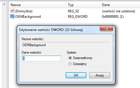 Teraz należy wejść w odpowiednią gałąź: HKEY_LOCAL_MACHINE\SOFTWARE\Microsoft\Windows\CurrentVersion\Authentication\LogonUI\Background Po prawej stronie okienka powinniśmy widzieć wpis dotyczący wartośći domyślnej. Przed jakimikolwiek zmianami wykonujemy backup obecnego stanu rejestru. Klikamy prawym klawiszem myszy na gałąź rejestru o nazwie background. Wybieramy opcje Eksportuj, w nowym oknie wybieramy miejsce gdzie chcemy zapisać daną część rejestru i po wybraniu nazwy dla pliku klikamy zapisz. Gdy mamy już pliczek z obecnym stanem rejestru to możemy przejść do zmiany wpisów w rejestrze. W prawej częsci okna edytora rejestru klikamy prawym klawiszem myszy i wybieramy: Nowy -> Wartość DWORD (32-bitowa) Nadajemy jej nazwę OEMBackground, następnie klikamy ją dwarazy i nadajemy jej wartość 1